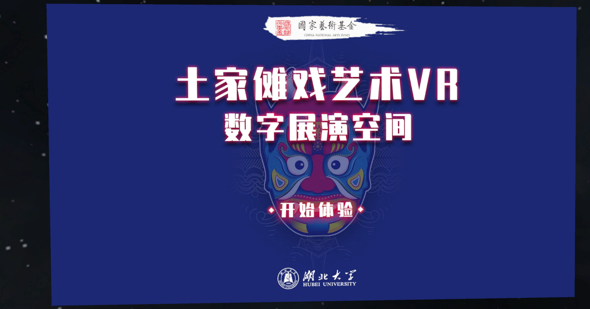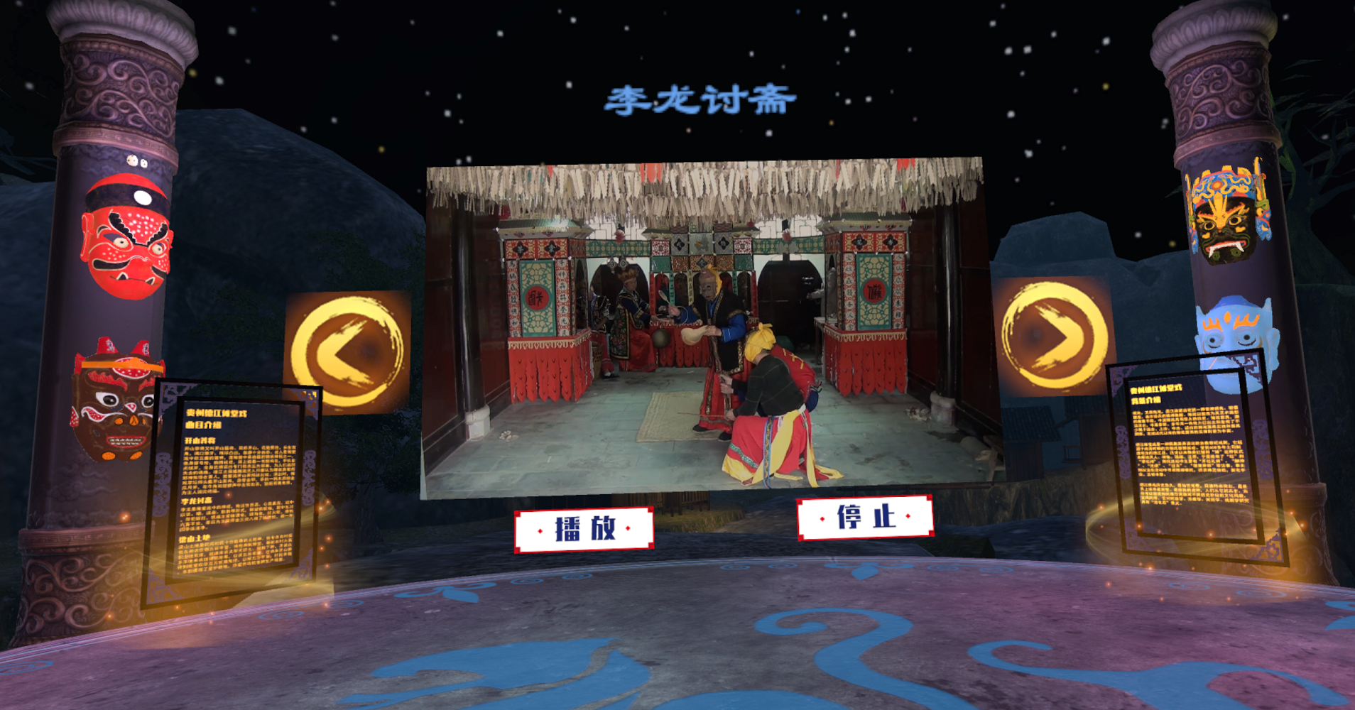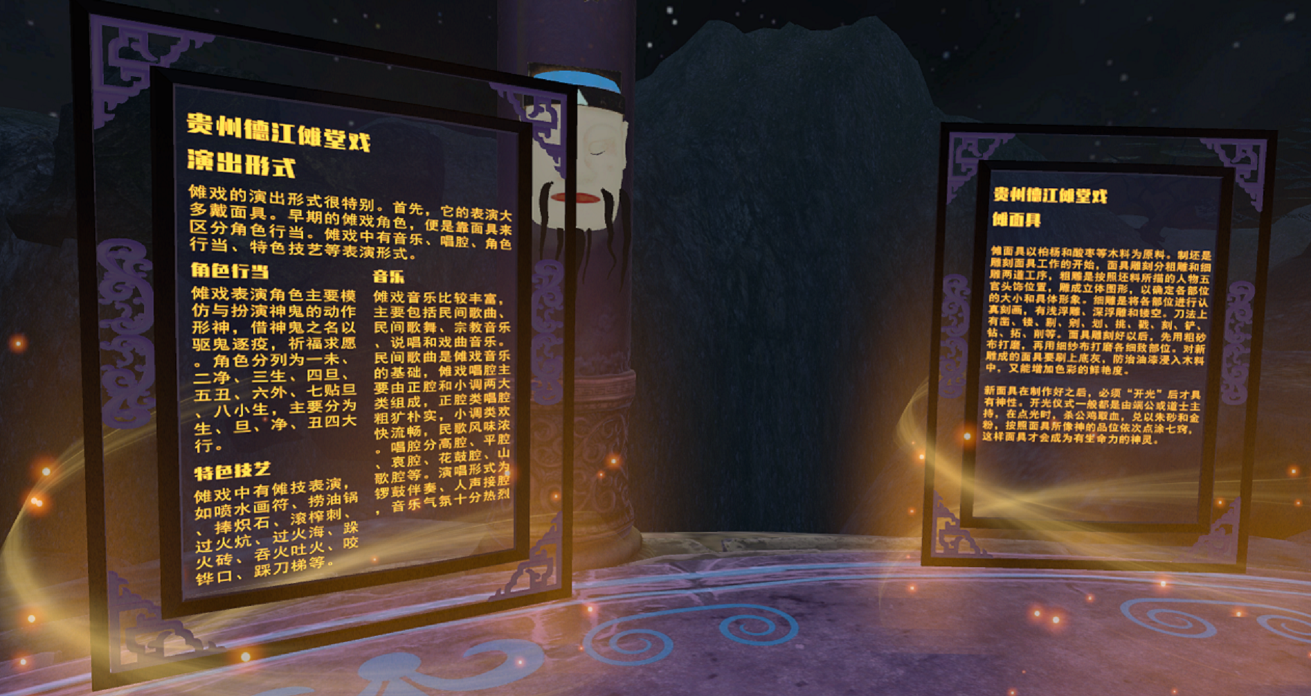 本作品将虚拟现实技术与德江傩堂戏非遗项目相结合,其VR交互体验模式通过手柄圆盘,设置用户在圆形广场中移动穿越功能,在环形区域外围一圈设置边界,每当观众试图走出广场时,悬浮UI会提示观众不要跨越活动范围,从而限制观众在指定区域内观赏。用户手持手柄,主要通过点击的方式进行移动或者选择曲目。当观众选择“观赏模式”后,会来到圆形祭祀广场外围,整个广场都由大理石制成。从起点位置开始,外围设置了木质展示牌,用于图文资料展示。并全程伴随语音讲解。观众在UI箭头的引导下,沿外围一圈了解傩戏相关资料,全程也伴随语音讲解。通过虚拟现实沉浸式交互系统的方式展现德江傩堂戏的民俗特点和整体风格。