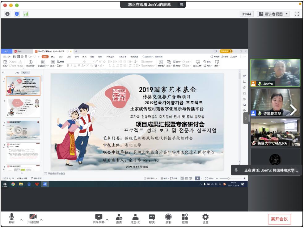 이 화상 심포지엄은 중국 국가 예술기금 프로젝트의 일환인 “중국 토가족 전통마을의 디지털화 전시 및 홍보 플랫폼”을 주제로 한서대 대학원 애니메이션학과에 재학 중인 중국 유학생들과 호북대학 여일계(余日季) 교수, 공덕외(孔德巍 ) 교수 등이 참가해 진행됐다.